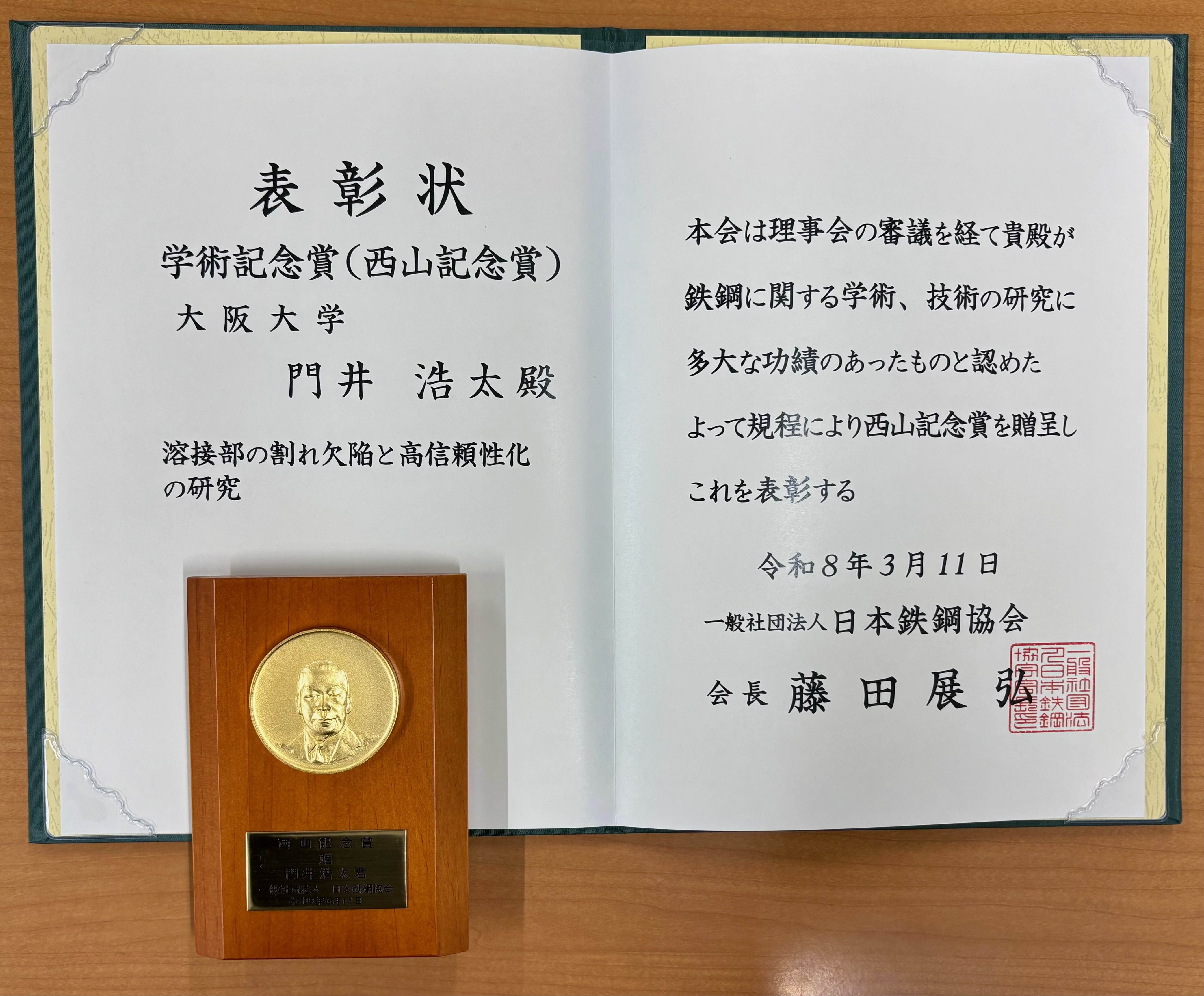 門井 浩太 准教授(接合組織評価学分野)が(一社)日本鉄鋼協会より「学術記念賞(西山記念賞)」を受賞