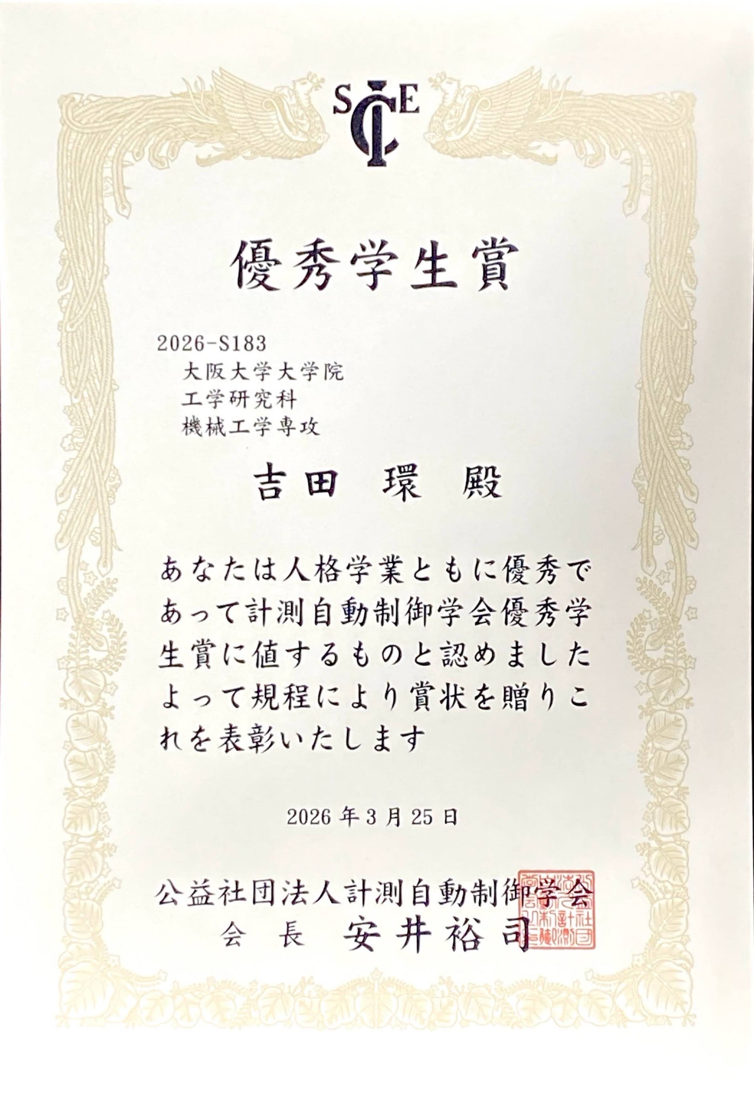 吉田 環さん(レーザプロセス学分野 院生)が(公社)計測自動制御学会より「優秀学生賞」を受賞 記事