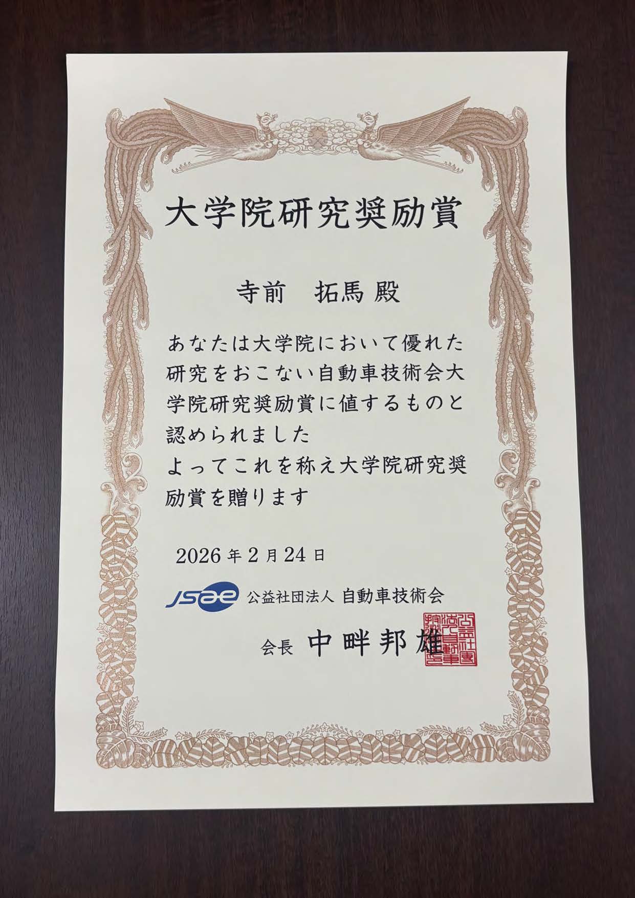 寺前 拓馬さん(複合化機構学分野 院生)が(公社)自動車技術会より「大学院研究奨励賞」を受賞 記事