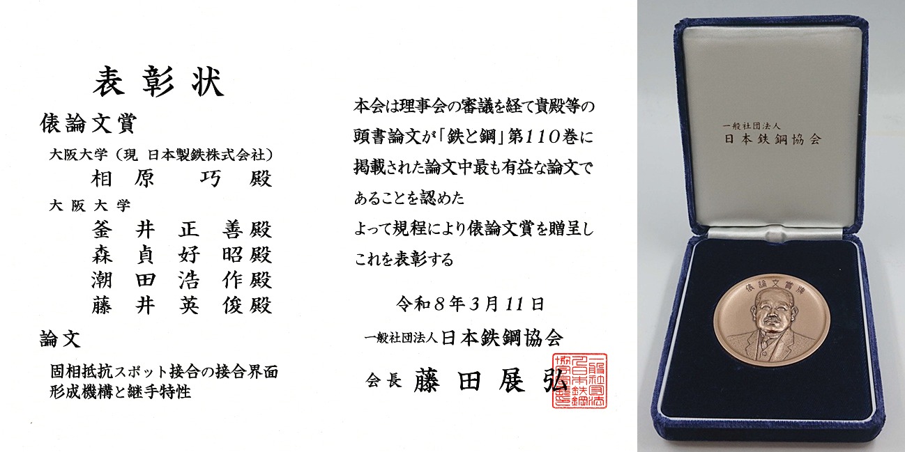 相原 巧 招へい研究員(日本製鉄ものづくり未来協働研究所)、釜井 正善 特任研究員、森貞 好昭 特任准教授、潮田 浩作 特任教授、藤井 英俊 教授(接合界面機構学分野)が、(一社)日本鉄鋼協会より「俵論文賞」を受賞