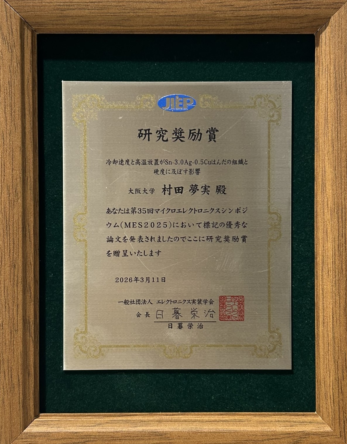 村田 夢実さん(微細接合学分野 院生)が(一社)エレクトロニクス実装学会より「MES2025 研究奨励賞」を受賞