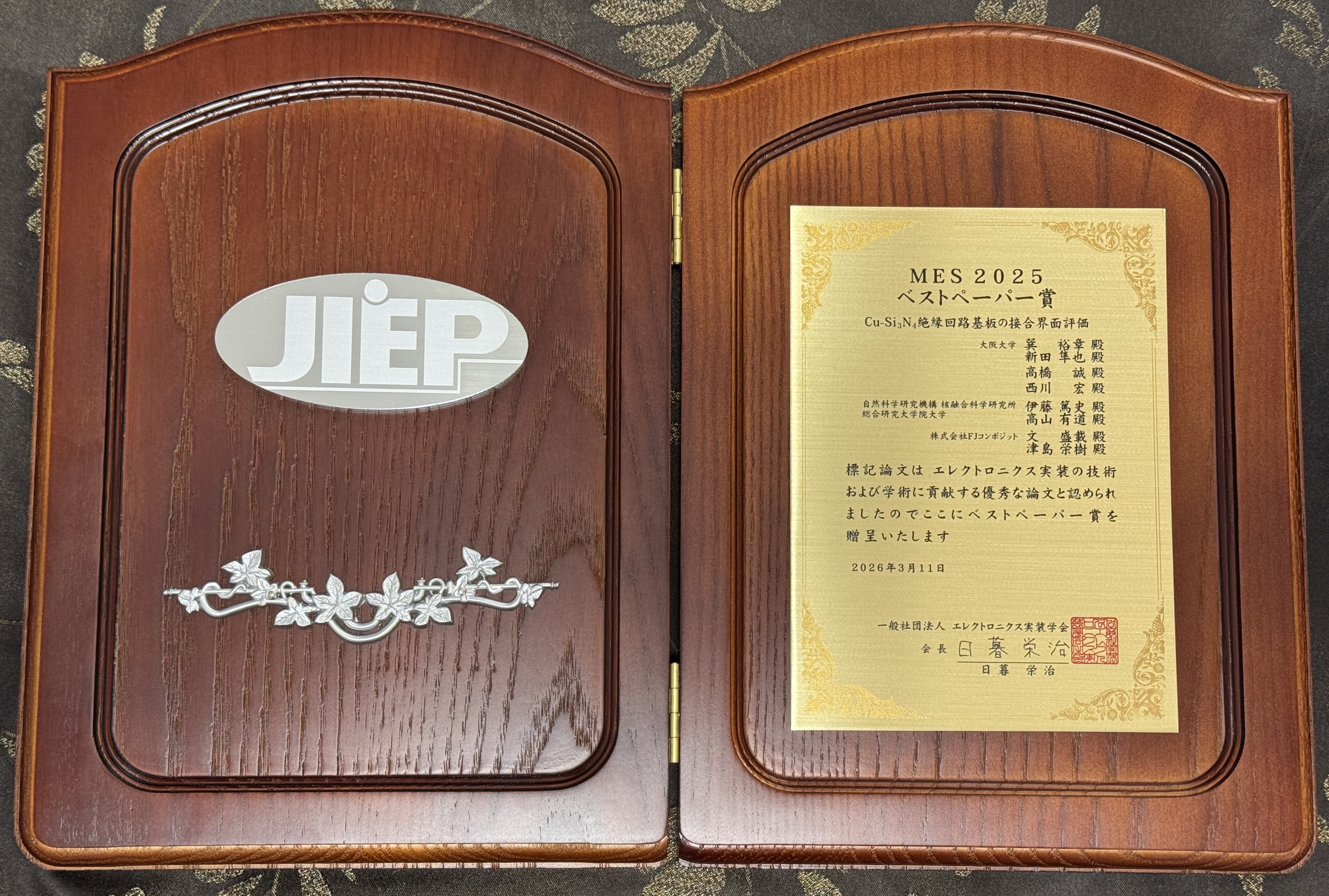 巽 裕章(微細接合学分野 准教授)、新田 隼也さん(微細接合学分野 院生)、高橋 誠(接合界面微細構造解析室 講師)、西川 宏(微細接合学分野 教授)が(一社)エレクトロニクス実装学会より「MES2025ベストペーパー賞」を受賞