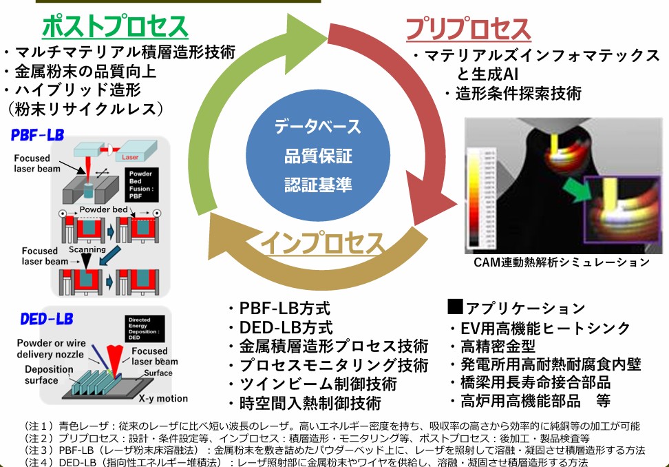 本プロジェクトでは、プリプロセスで「高性能な造形条件等の探索・シミュレーション技術とデータプラットフォームの一体化」、インプロセスで「プロセスの安定性向上および造形技術の高度化」およびポストプロセスで「金属粉末の品質向上・製造技術の高効率化」をテーマに開発します。最終的に各プロセスを連携させた「統合型レーザー金属積層造形システム」を構築し、さらなる高機能な部品製造・リードタイム短縮に資する生産プロセスを確立します。
